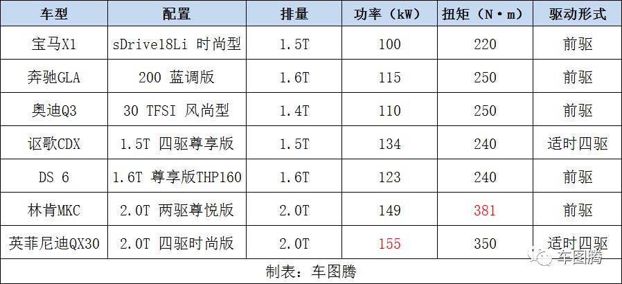 通过对比可以看出,宝马X1车身和轴距最长,林肯MKC最宽、最高,奔驰GLA高度最低,奥迪Q3最短。