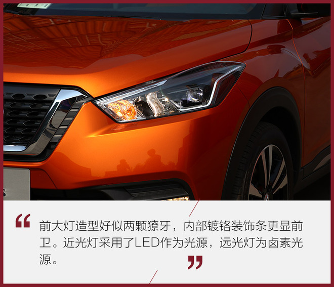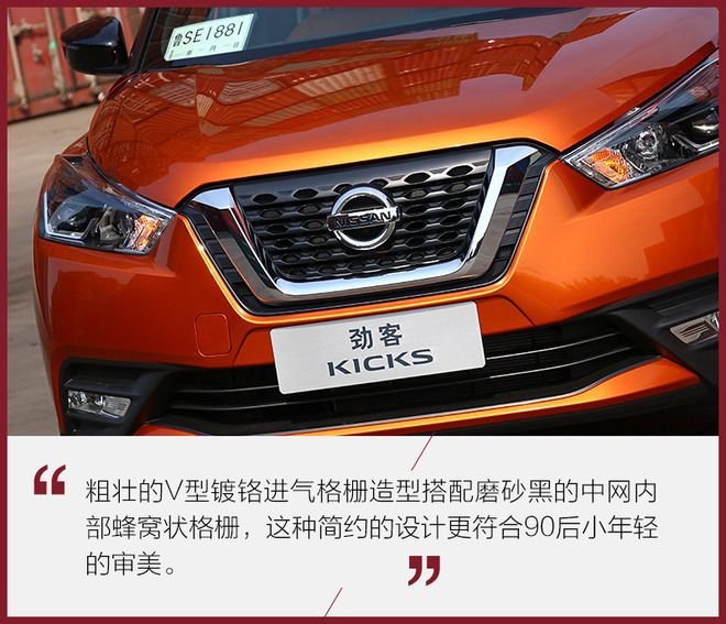 东风日产劲客的前脸依旧由日产最新V-Motion家族设计元素打造,只不过由于小型SUV的车身尺寸过于小巧,所以前脸V字形镀铬格栅的折角更倾斜,以营造一种更有力量的感觉。