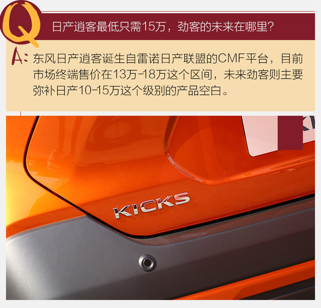 东风日产劲客的原型车是2014年日产在巴塞罗那首发的Kicks Concept概念车,该车由日产美国设计中心和日产巴西设计中心联合开发。新车基于雷诺日产联盟开发V平台打造,并采用CMF-B共用零件平台生产,主打年轻消费群体。