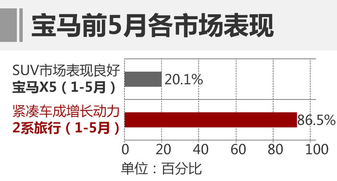宝马旗下各款车型市场表现良好,宝马X5继续领跑中大型豪华SUV市场,前五个月累计销量同比增长20.1%;旗舰车型新7系在前五个月的销量中累计超10,000辆;宝马5系车型换代在即,却一直保持稳定的增长态势,前5月累计销售超过62,000辆。