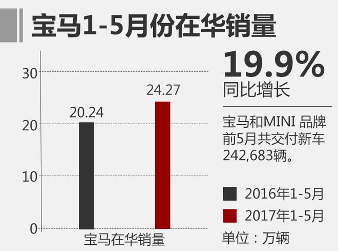 根据官方公布的信息,宝马集团5月份在华继续保持稳健增长的良好态势,前5月共交付新车242,683辆,相比去年同期增长19.9%。其中5月份单月销量增长高达27.1%,销售新车数量达到50,986辆。