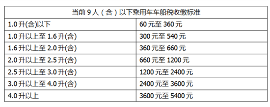 目前国家相关部门还没有发布新的车船税(车船使用税)计费标准,而是沿用2012年新的车船税标准。核定载客人数9人及以下的乘用车按照7个档次征收: