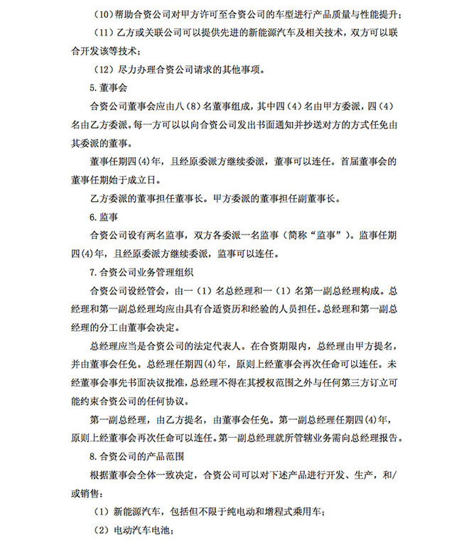 合资公司董事会共由八位董事组成,其中四位由江淮方委派,另外四位由大众方委派,其中,大众方委派的董事担任合资公司董事长,江淮方委派的董事担任副董事长。另外,总经理由江淮方提名并由董事会任免,第一副总经理由大众方提名并由董事会任免。