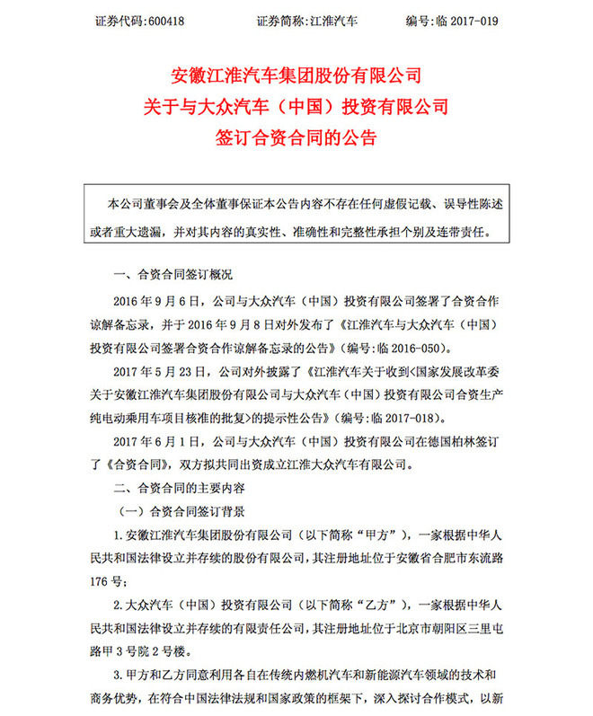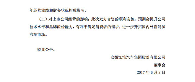 以下为江淮汽车公告原文: