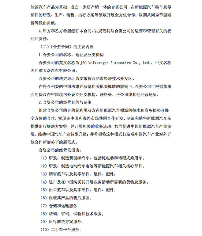 该协议的签署为合资企业的建立,包括新能源汽车零部件的研发与生产、互联技术、汽车数据服务等领域的发展创造了更多良好条件。按照合资协议,新工厂和研发中心将在未来陆续建立。此外,合资企业还计划建立新的二手车平台,并积极从事所有相关的业务活动。按计划,新成立的合资企业将于2018年正式投产首款电动汽车。