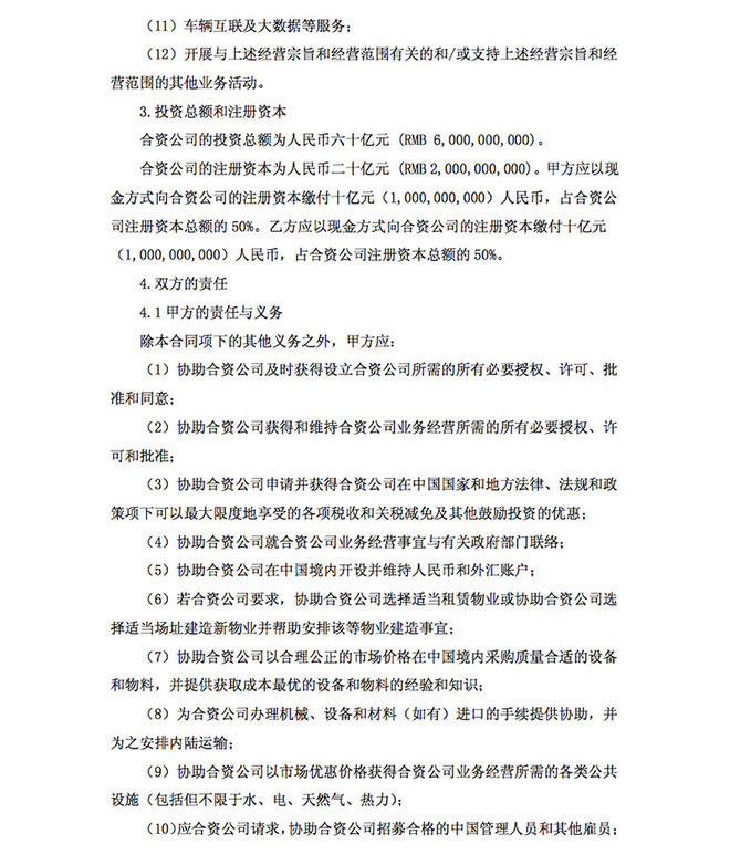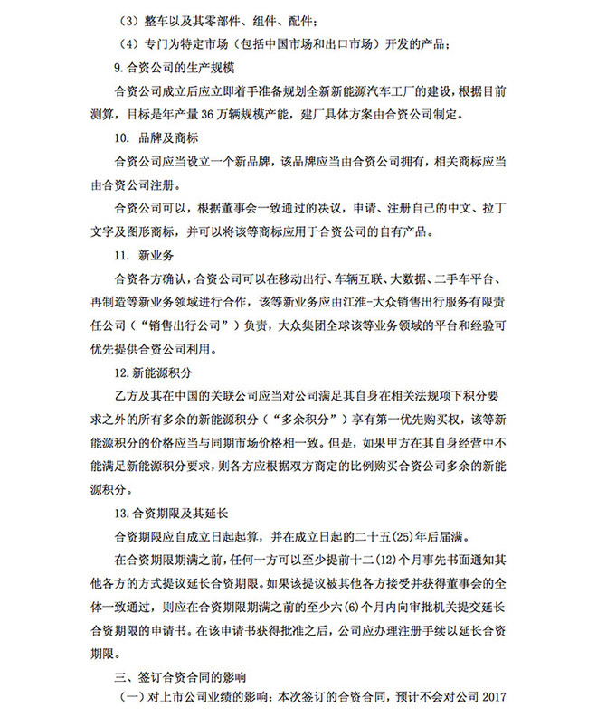 合资公司成立后应立即着手准备规划全新新能源汽车工厂的建设,根据目前测算,目标是年产量36万辆规模产能,建厂具体方案由合资公司制定。