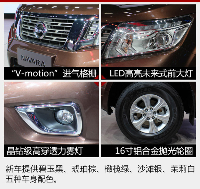 郑州日产纳瓦拉定位于“SUV级皮卡”,外观延续了海外版车型的设计,采用了日产家族式“V-motion”前格栅,并且加入大面积镀铬装饰,整体造型硬朗时尚。同时,新车还配备有同级别独有的LED未来式大灯、竖形尾灯和16英寸铝合金轮圈。尾部造型简洁,侧面线条肌肉感突出,十分动感。