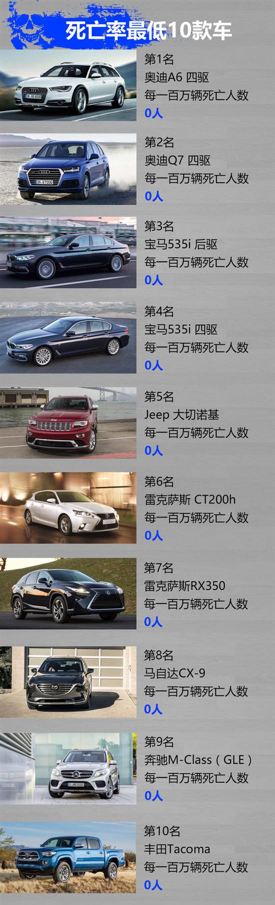 因为这个调查结果只是针对驾驶员死亡进行统计,所以驾驶员0死亡的情况还是很靠谱的。这个调查结果的前11名驾驶员死亡率都是0,这个结果可以看出大车在发生事故时确实存在优势,并且这其中豪华车占据主流。豪华品牌丰富的主被动安全配备可以大大降低车内乘员死亡或者受伤的可能性。(最安全的10款车排序根据品牌首字母排序,排名不分前后)。