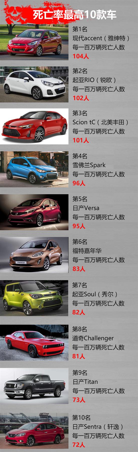 死亡率最高前两名让韩国现代与起亚占据,这两款车都是小型车,同时还是一个平台的产品,两款车在国内目前只有老款车型,并且已经停产,新款还未引入到国内,这两款车型如果未来能够引入国内,购买需谨慎。