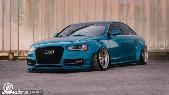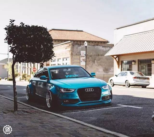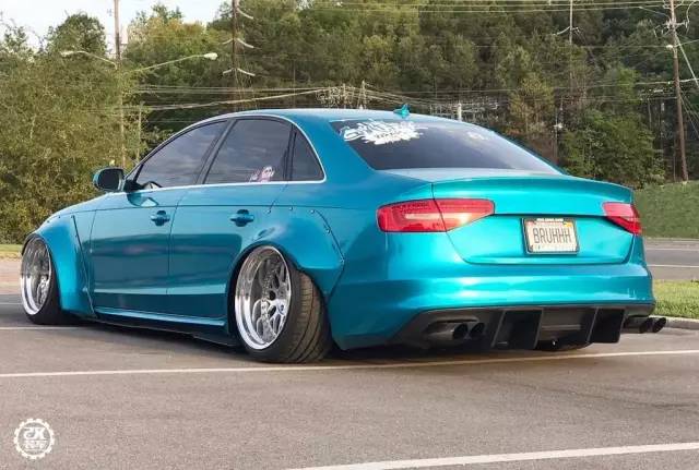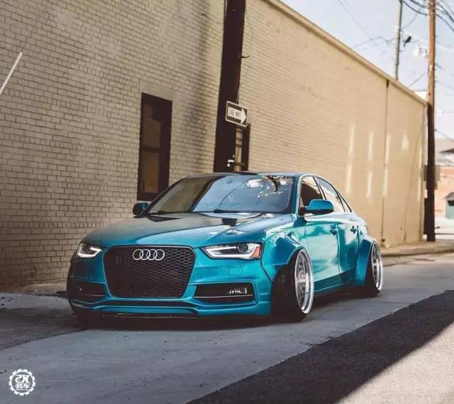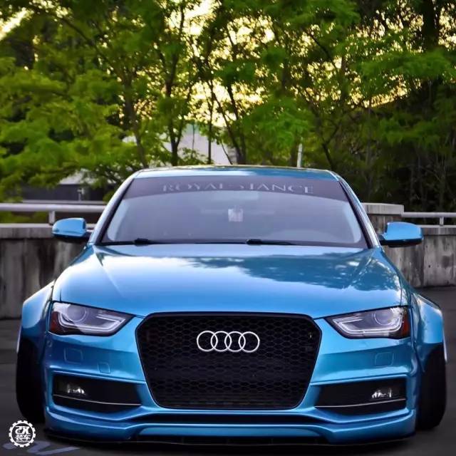 像奥迪A4这款热门的中级轿车,改装的自然不在少数。今天的这辆A4贴上了一身冰蓝色的3M贴膜,改装了一套仿照Rocketbunny宽体的套件,让这辆精致的德国车多了几分野性。