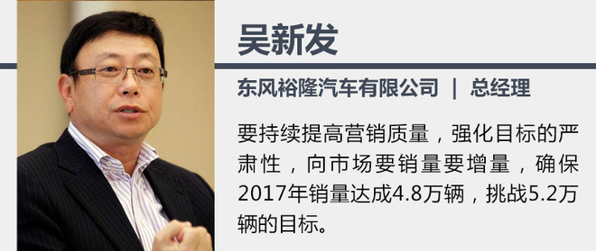 东风裕隆总经理吴新发表示,东风裕隆2017年要持续加大研发投入,全力促成新产品按时投放,并持续推进品质提升,确保质量(IQS)优于行业平均,保持自主品牌领先;集中力量降低主力车型成本,改善主力车型收益。在谈及销量目标时,他强调:“要持续提高营销质量,强化目标的严肃性,向市场要销量要增量,确保2017年销量达成4.8万辆,挑战5.2万辆。”(图/文 网通社 吴楠启)