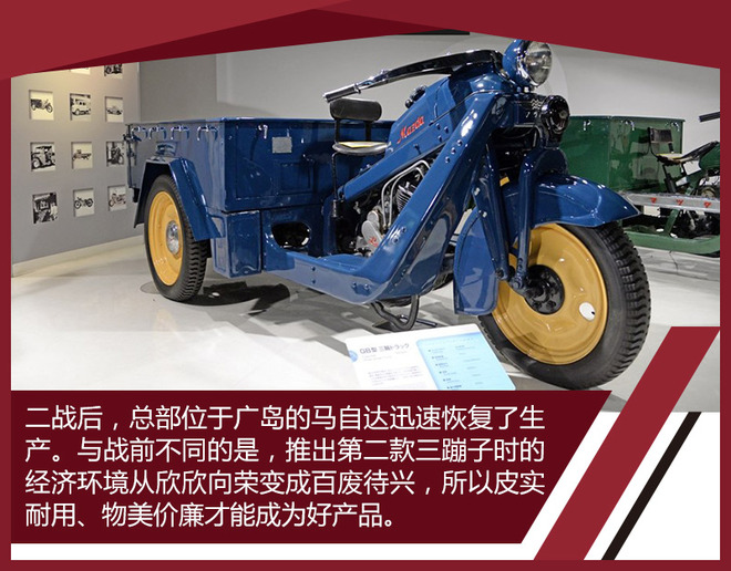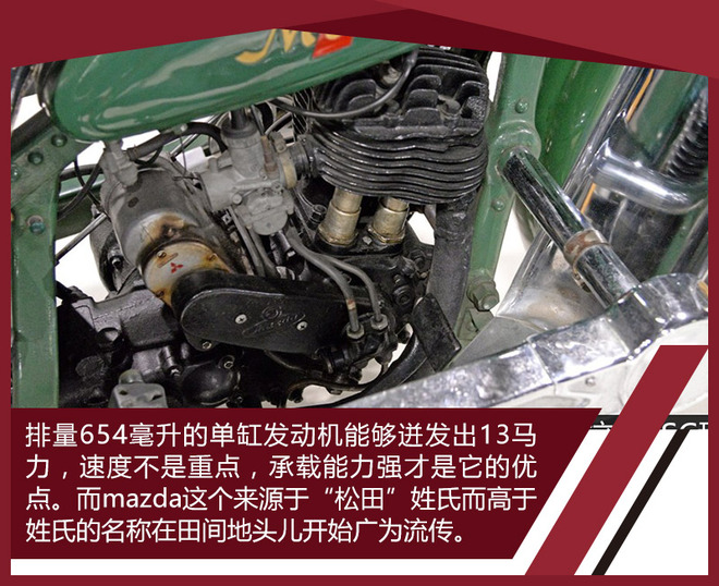 在整个二战前,马自达就只有这一款三蹦子问世,第二款三蹦子直到二战结束后才推出。这款名为GB三蹦子是马自达第二款摩托车,乍看之下和马自达号的区别并不大,但是换装了全新的700毫升单缸发动机,但是它的载重量能达到500公斤。
