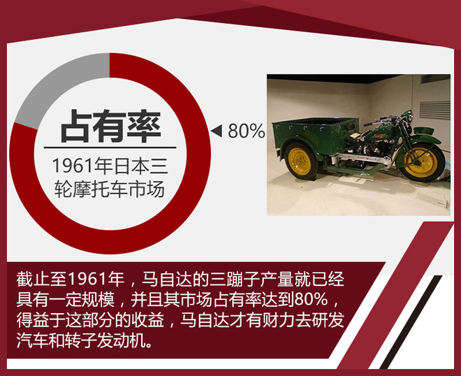 今天我们已经很难想象出马自达三蹦子有多火了,不过下面有一些数据还是能够让我们能够略知一二,截止到1961年马自达三蹦子的年产量就突破了45000辆,日本三蹦子市场中80%均出自马自达之手, 几乎垄断了整个市场。