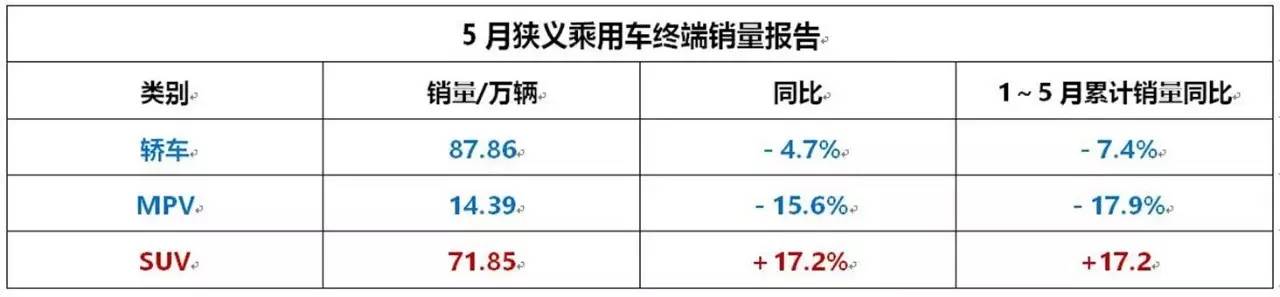 制胜新能源SUV市场,比亚迪蒸蒸日上稍微盘点一下就会知道,目前不论是自主还是合资都在向增速明显的SUV市场投入更多资源,毕竟眼下车市除了SUV细分市场外,轿车和MPV都呈现出销量下滑的态势。从乘联会公布的5月份销量数据中就不难发现这点。5月份轿车和MPV分别销售87.86万辆、14.39万辆,同比分别下滑7.4%、17.9%。只有SUV细分市场持续火热,同比增长17.2%,成为乘用车中唯一增长的细分市场。
