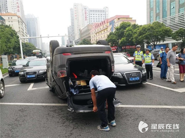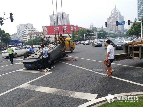 6月20日早上7时30分左右,一辆车牌为湘A8S**Y的Jeep越野车沿长沙市天心区芙蓉路由北往南行驶至城南路口时,与在该路口等红灯的湘A767**宝马轿车和湘AYY5**长安轿车两台车相撞后,导致车辆侧翻,现场无人员伤亡情况。