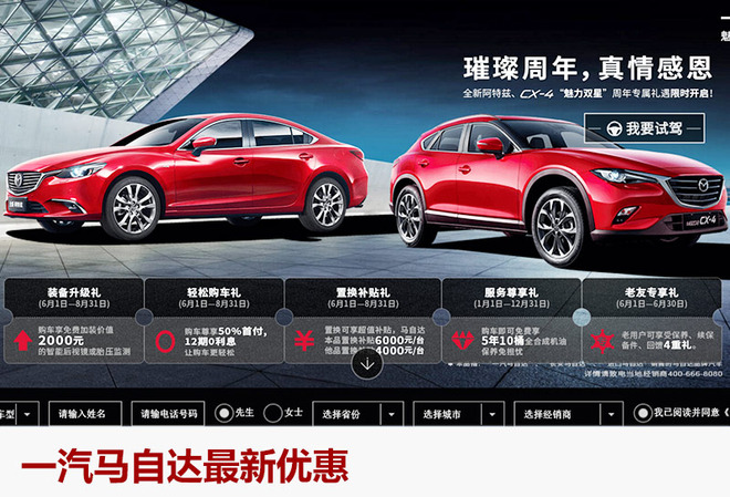 一汽马自达在给CX-4庆生的同时,还公布了答谢新老车主的最新优惠活动。即6月份正式开启“璀璨周年,真情感恩”周年活动,新购或换购CX-4和全新阿特兹的消费者,可以享受到包括装备升级、置换补贴、优惠金融服务等五重优惠政策。(图/文 网通社 张雪莲)