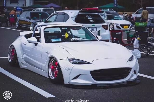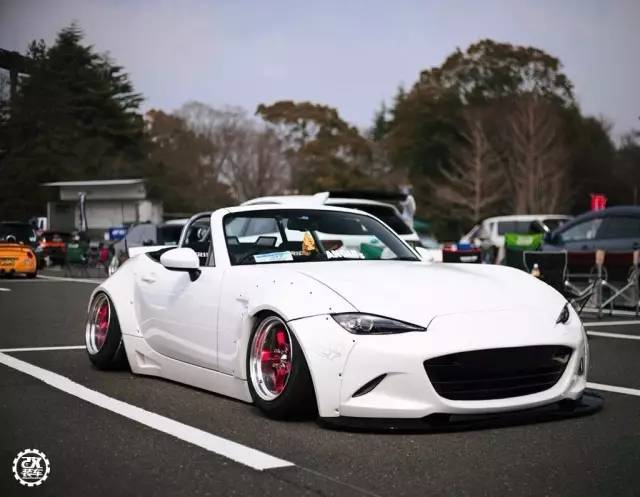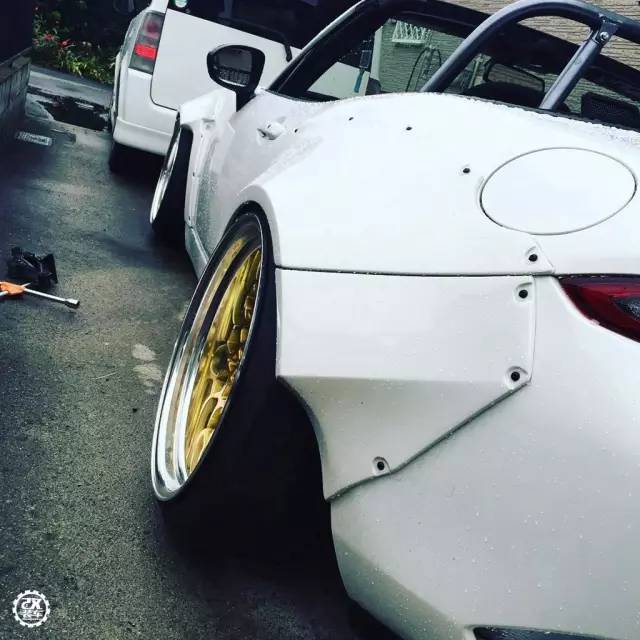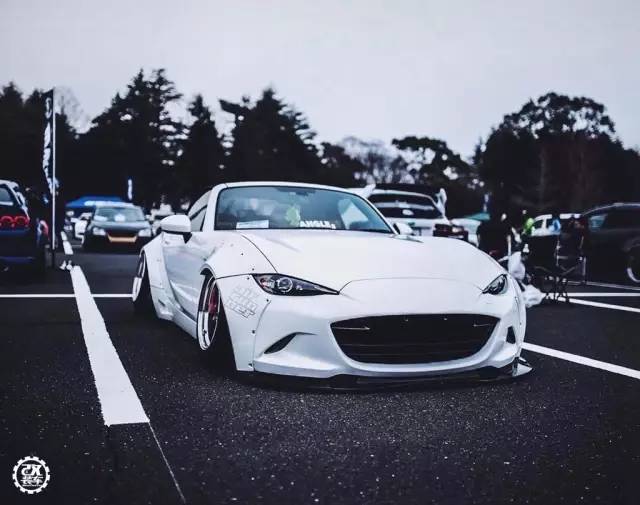 今天我们就来看看邻国的朋友怎么玩这辆个性小车的。车主首先给这辆MX-5换上了一套Aimgain的宽体包围,包围采用铆钉固定的方式,外扩的叶子板让它看起来凶恶了不少,向前突出不少的前下扰流让这辆MX-5更加贴地。