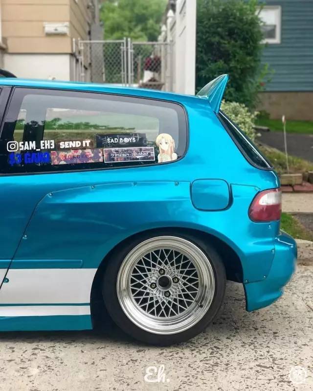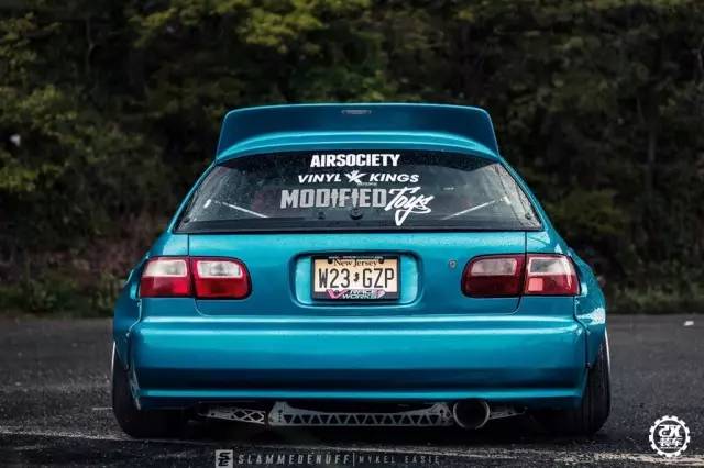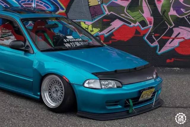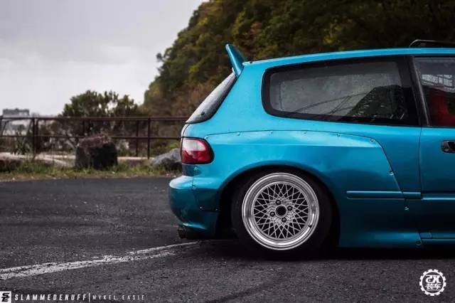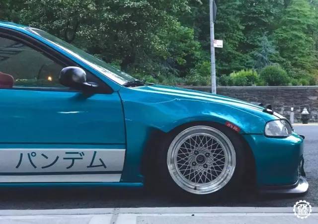 今天介绍的这辆思域换上了一身像是糖果一样的蓝色车漆,跟一般低趴姿态的五代思域不同,车主给它装了RocketBunny的宽体套件,不过前翼子板的宽体套件是来自86的样式,十分有意思。