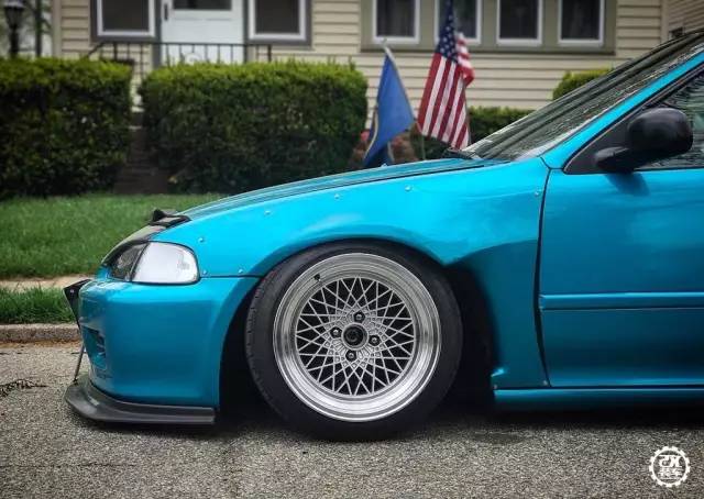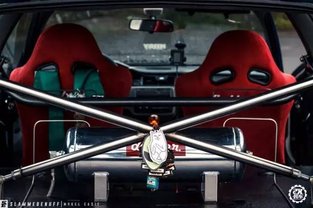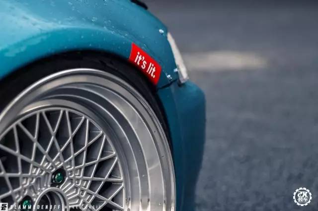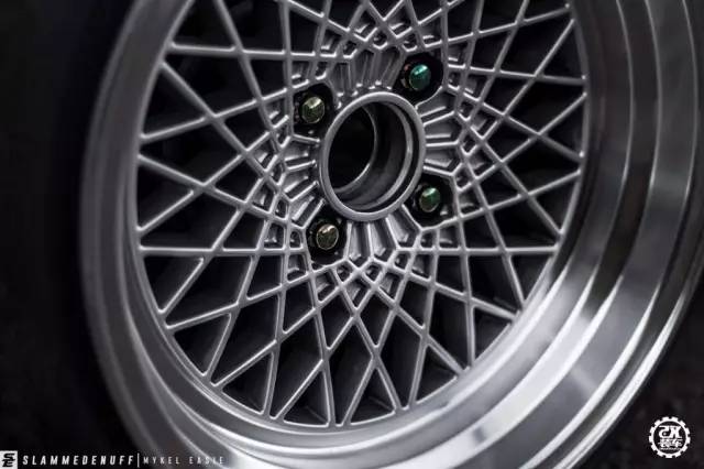 安装宽体之后,车主找来了一套15英寸9.5J的NS DIV2轮毂,复古的造型与经典的车身造型很是般配,在通过Airlift气动避震降低车身之后,呈现出了Hellaflush的唯美姿态。