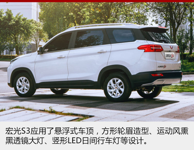 外观方面,新车前脸采用家族化单辐蜂巢式进气格栅,并配有镀铬饰条点缀。除此之外,宏光S3应用了悬浮式车顶,方形轮眉造型、运动风熏黑透镜大灯、竖形LED日间行车灯等设计和搭配,车身侧尾部采用“WULING”字样的设计。