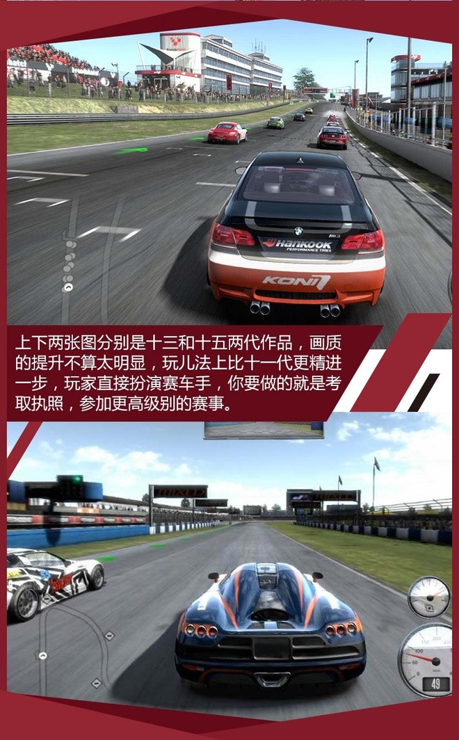在极品飞车系列中,第11、13和15代作品是非常特殊的,它一改非法飙车的“匪气”,让玩家在游戏中走进了赛道。如果说第11代给人的感觉仍然是玩家扮演汽车发烧友参加各种民间赛事的话,那么第13代和15代的感觉就更为专业,作为职业车手的你要去挑战世界上知名赛道,升级自己的赛照去参加高级组的比赛。是不是感觉和很多主打模拟赛车游戏很像?确实,特别是第13代和第15代给人的感觉就像《科林麦克雷》系列和家用机的《GT》系列的拟真感觉,因此很多死忠玩家表示了强烈不满,比如我的同事思哥,他就十分不喜欢第11、13和15这三代。