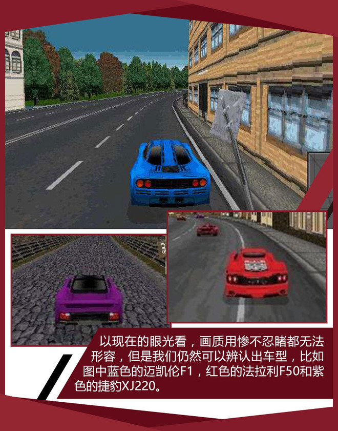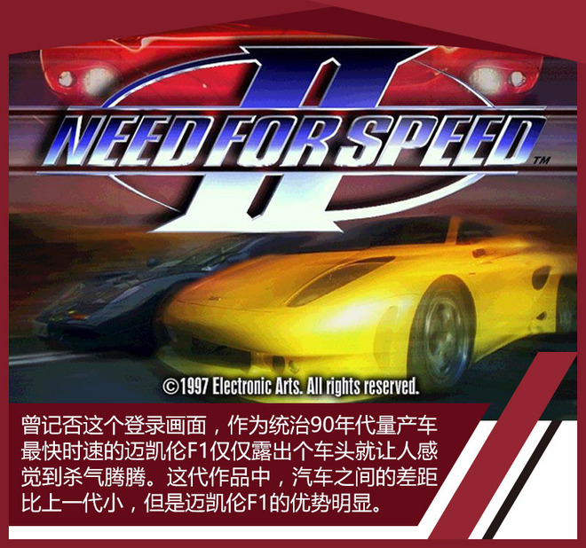 笔者接触极品飞车系列是从第二代开始,除了游戏本身之外,它最吸引我的地方是说明书,游戏中出现的每款车型都有详细的说明,包括加速、刹车成绩,发动机马力和扭矩,而且用的英标单位,这算是笔者第一次接触汽车类的评测文章,感觉相当高大上。另外游戏中的明星车自然是迈凯伦F1,除了它之外的8款车无论在当时还是现在,都属于稀有车型,比如捷豹XJ220,这是我在很多期栏目中都反复提到的车型;还有莲花V8这种稀世珍宝,以及很少能在极品飞车系列中露面的法拉利车型。