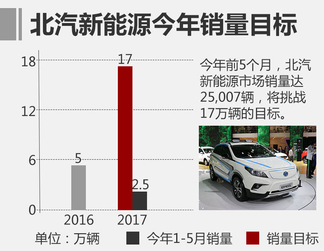 北汽新能源在今年初提出了全年冲击17万辆销量的目标,这一数字相当于2016年销量的3倍之多,但EC180推出后的良好市场表现增强了其实现目标的信心。北京新能源汽车股份有限公司副总经理、北京新能源汽车营销有限公司总经理张勇在与网通社沟通时表示:“公司下半年将发力双品牌,通过新产品的上市把握住新能源市场下半年的销量高峰,尽最大努力解决电池产能等问题,力争完成全年目标。” 从其前5个月销量来看,北汽新能源若要完成全年销量目标,需要在下半年实现销量成倍增长。