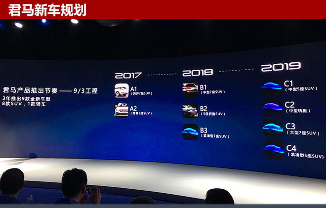网通社从君马汽车官方获悉,君马将在未来3年内推出8款SUV、1款轿车共计9款产品,其中全新跨界7座SUV、5座SUV将在年内正式上市。君马强调,将通过运用TPDS研发体系、TMA超级平台和Airflow气流系列发动机等技术打造贴近消费者需求的产品。