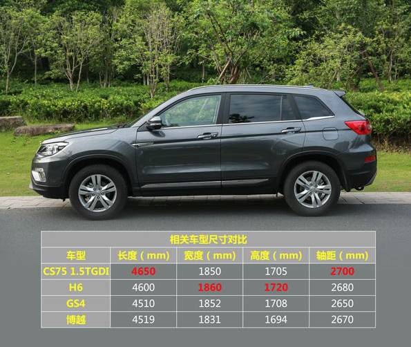 CS75尚酷版外形上并没有太多变化,可以忽略不计。但是与时下最火的几款自主品牌SUV相比,CS75的外形尺寸以及轴距还是非常有优势的。