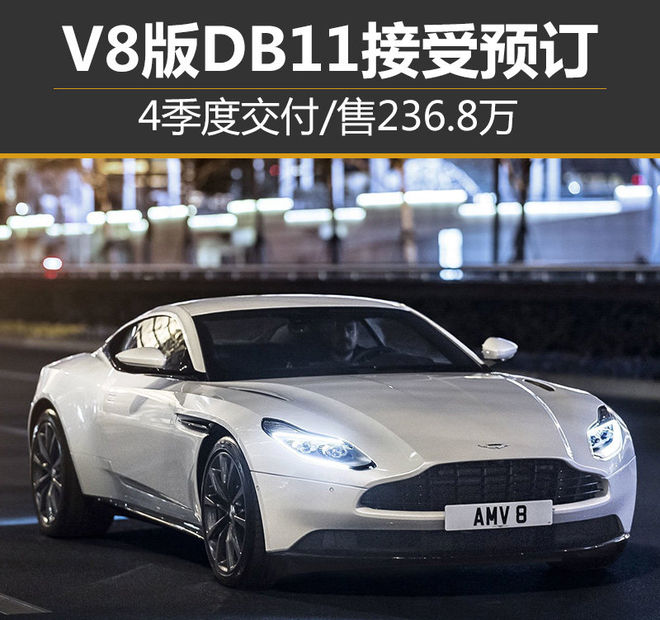 2016年,阿斯顿·马丁推出了超豪华GT跑车DB11 (配置|询价),搭载5.2升V12双涡轮增压发动机。如今随着新款4.0升V8发动机的加入,DB11将增加一款入门版车型。网通社从阿斯顿·马丁官方获悉,搭载4.0升V8发动机的DB11现已开始接受预定,中国市场的建议零售起配价是236.8万元。新车将在6月29日至7月2日举行的古德伍德速度节上正式发布,并于今年4季度交付。