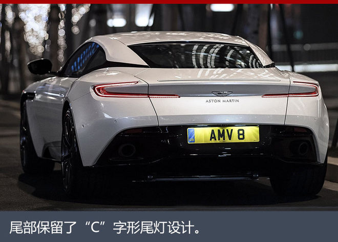 DB11 V8车型的车圈采用双五辐设计,车门上采用隐藏式门把手,配合车身整体简洁流畅的线条,运动感十足。尾部依旧保留V12车型造型设计,“C”字形LED尾灯的下方为双边共两出的圆形排气尾喉。