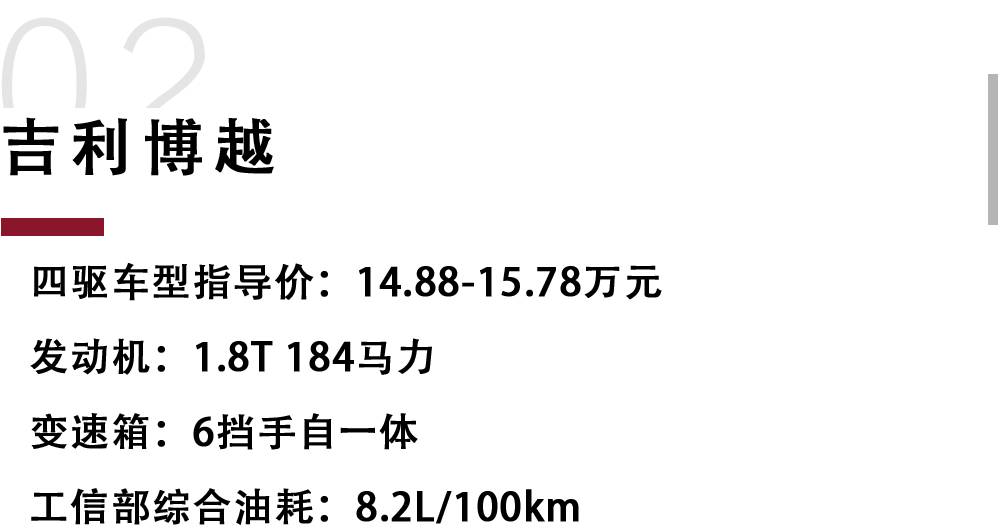 砖叔点评:砖叔曾经在越野场地中测试过吉利博越的四驱车型,虽然它离地间隙偏小但四驱系统表现可圈可点,能顺利通过各种陡坡、交叉轴等越野项目。不仅如此,它的公路行驶能力也让砖叔印象深刻,尤其是它优秀的隔音表现以及良好的行驶品质。