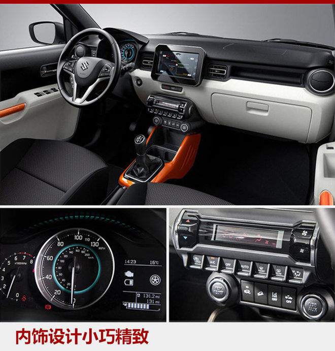 铃木IGNIS内饰设计小巧精致,中控台配备大尺寸触控屏,各区域划分鲜明,同时按键较大,易于操作,全新设计的多功能方向盘可控制手机蓝牙通话。此外,新车配有自动空调、一键启动、6个安全气囊和车道保持、车身电子稳定程序等配置。