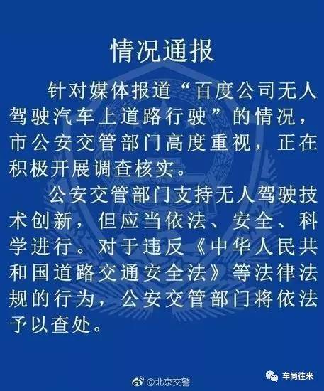 7月6日,北京交警官方微博发布微博称“针对媒体报道‘百度公司无人驾驶汽车上道路行驶’的情况,北京市公安交管部门高度重视,正在积极开展调查核实。”并表示“公安交管部门支持无人驾驶技术创新,但应当依法、安全、科学进行。对于违反《中华人民共和国道路交通安全法》等法律法规的行为,公安交管部门将依法予以查处。”