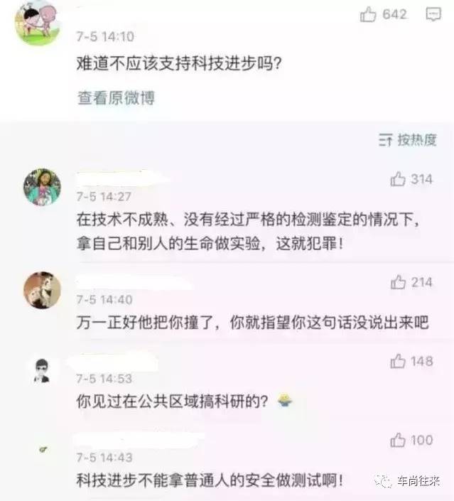 对此表姐认为大力发展智能汽车科技是好事,但是把一些不成熟的技术、错误的信息传递到观众面前,实属不妥。其实百度搞无人驾驶,我们自然都是支持的,毕竟国人如果主导了世界顶尖的无人驾驶技术,最大的受益者当然还是中国的消费者。但是无人驾驶还处于测试阶段,贸然上五环,吓坏旁边的司机大叔大妈也是不太好的。