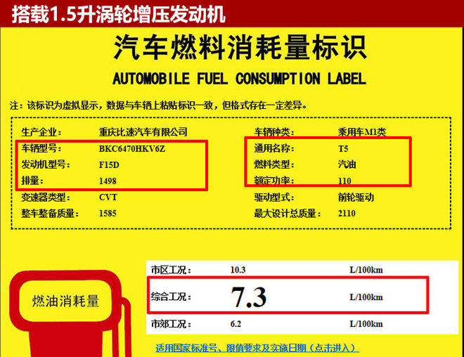 从国家工信部公布的信息可知,比速T5将沿用现款车型所搭载的1.5升涡轮增压发动机,额定功率110千瓦,其最大变化在于传动系统方面匹配一台全新CVT变速箱,百公里综合油耗7.3升。