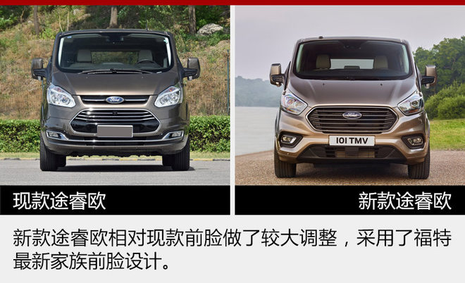 外观方面,新款途睿欧采用了福特最新家族前脸设计,将原来分体式的前脸布局改为一体式,原来的梯形轮廓也变为了六边形,整体更偏向乘用车设计,更具有时尚感。此外,新车的大灯也经过再设计,由原来的三角形变为四边形,并提供有卤素和氙气两种。新款途睿欧前脸整体布局都有所改动,视觉上更加运动。