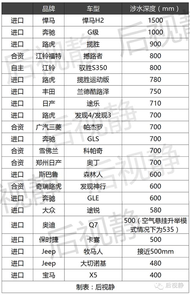 以下是20款SUV涉水深度调查,小伙伴们可以作为参考。