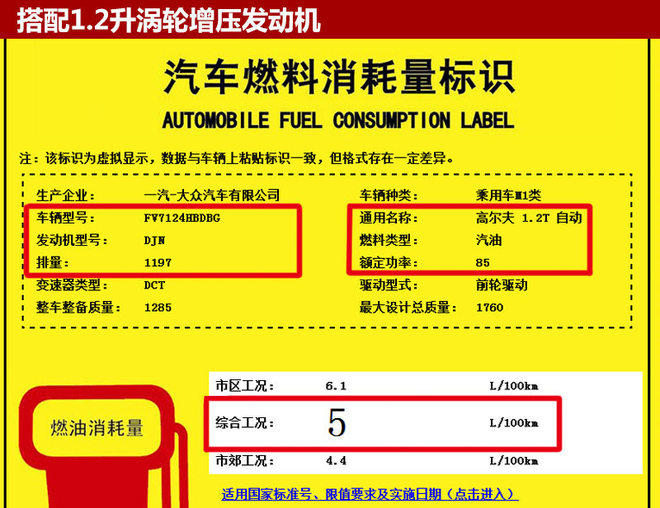 从国家工信部公布的信息可知,一汽-大众新款高尔夫将搭载一台型号为DJN的1.2升涡轮增压发动机,额定功率85千瓦,百公里综合油耗为5升。而现款车型所搭载的1.2T发动机最大功率为81千瓦,通过对比后可以看出,新车在动力输出方面有所提升。