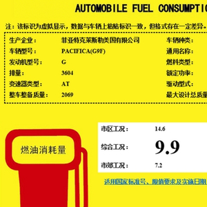 从新车的燃料消耗量标识来看,Pacifica车型将搭载一台代号为G型3.6L发动机,其额定功率为279马力(205kW),传动系统匹配的是9速自动变速箱。此外,该车的工信部综合工况油耗为9.9L/100km。(消息来源:汽车之家)