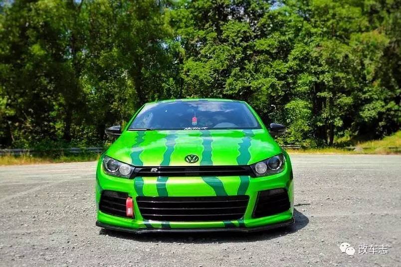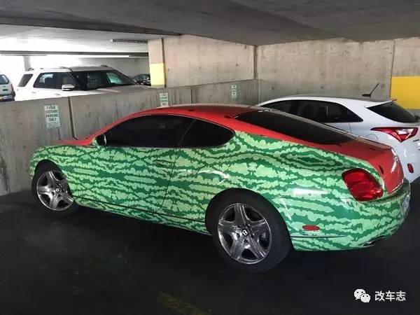 用了一段时间的绿色膜后,车主还是觉得太单调,突发奇想的把爱车贴上了西瓜纹路的拉花!最终成型的效果竟毫无违和感,简直就是一个行走的西瓜!