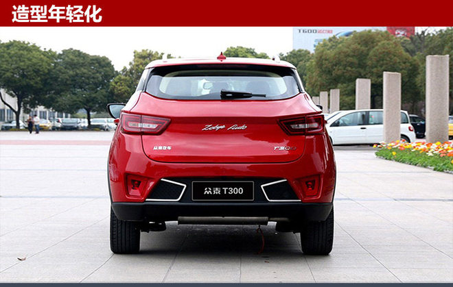 尾部方面,T300复杂线条让车尾看起来很有层次感,环形LED光源尾灯造型十分犀利;凹陷式雾灯的设计,搭配开放式四边形镀铬饰条,整体个性十足。尾箱盖中间位置带有“Zotye auto”英文车标字样标识。