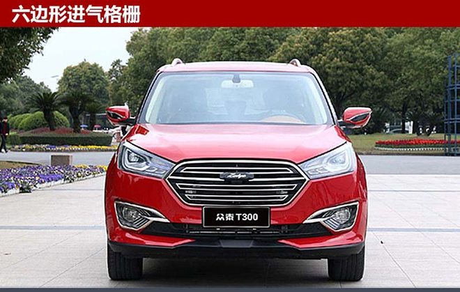外观方面,新车前脸采用六边形进气格栅,并被中央镀铬饰条划分为上、下两个区域;中间部分采用“Zotye”全新英文车标,配合两侧不规则造型大灯组,整体感很强。同时,T300的A、B、C柱全部涂黑,采用悬浮式车顶设计,上方带有银色行李架,中间是一块可开启的全景天窗。