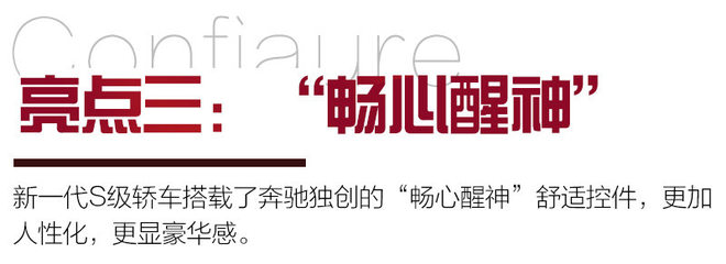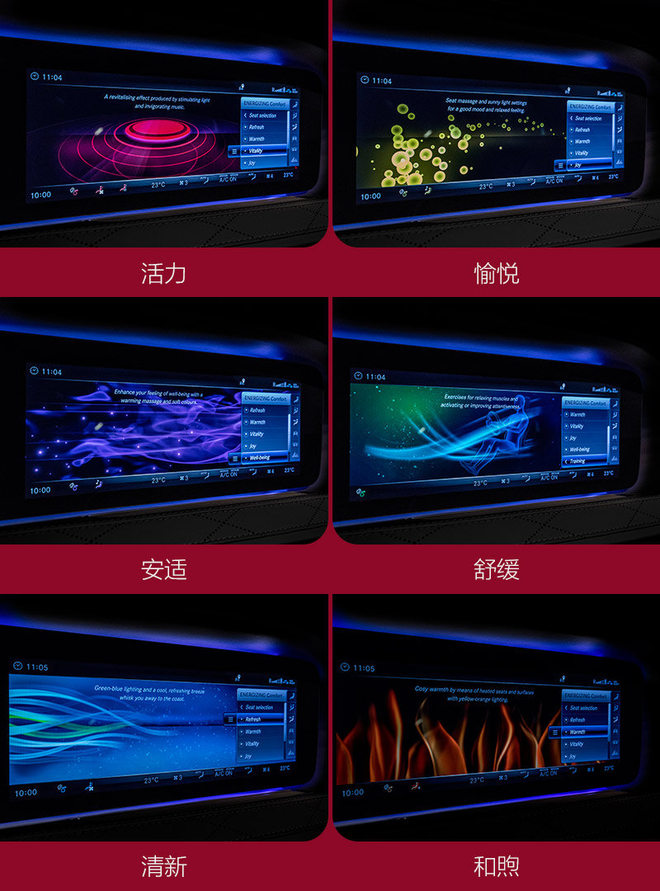 新一代S级在继续保持车内豪华氛围的同时加入了更具个性化的“畅心醒神”舒适控件,可以通过12.3英寸中央液晶屏幕在六种不同的风格中进行切换。该系统可将车内的不同舒适配置融合成一个智能的有机整体,当选定预设模式开启,驾驶者可通过一键操作实现空气调节、氛围照明、座椅按摩、通风加热、音乐香氛等多项功能的操作,快速切换至理想的车内空间,消除车内乘员的疲劳。