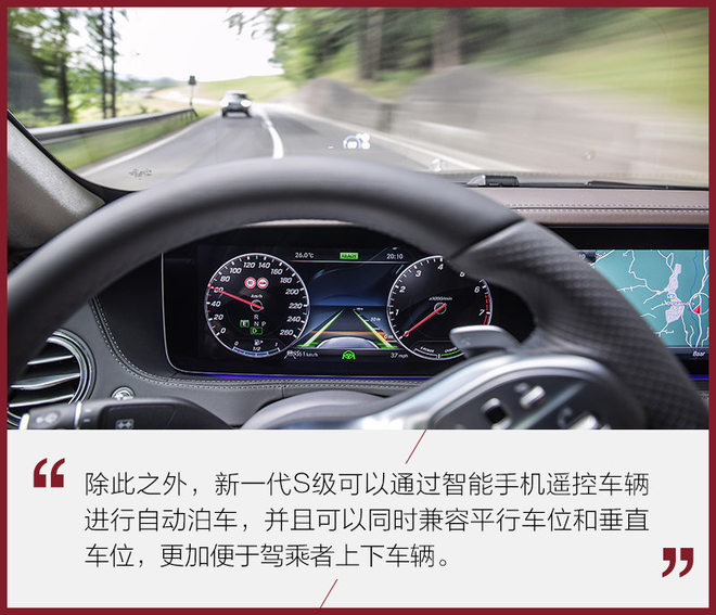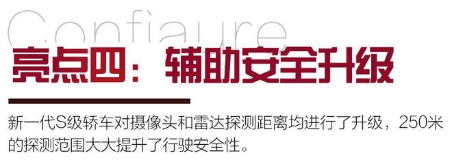 新一代S级将摄像头和雷达探头都进行了升级,250米的探测范围可以让车辆在更远的地方实行相应的安全操作,提升了行驶安全性。同时,立体摄像头可对弯路、十字路口、环岛和高速收费站等路面情况进行识别判断,减轻了驾驶员的疲劳和负担。另外,智能遥控泊车系统大大方便了车内乘员在停车后进出车辆,尤其是在宽度较窄,开门不便的停车位上,该功能无疑大大提升了日常使用的便利性。