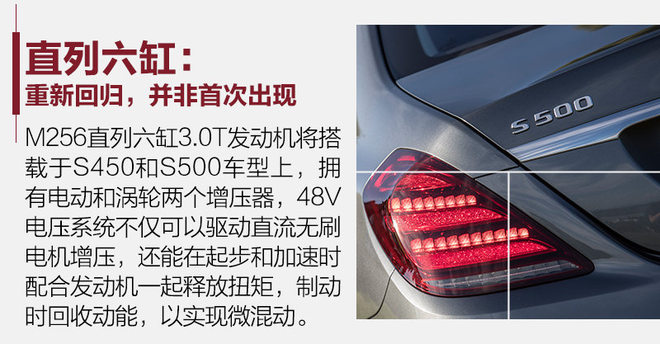 说起直列六缸,不少人总会第一时间想到奔驰的老对手宝马。其实不然,早年间的S级轿车使用的就是2.8L和3.2L两种排量的直列六缸发动机,此次中期改款后重新回归直六发动机的S级在技术上面有了巨大的飞跃,动力比肩八缸车型,燃油经济性也有了巨大提升。