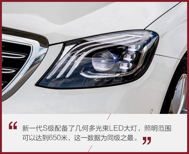 新一代S级装备的几何多光束LED大灯在照射范围和智能性方面的表现都相当出色,三道LED灯眉的设计也极具家族风格,辨识度高。它的智能调节和远近光控制不仅提升了科技感,免去了人为操作的麻烦,还能有效提升行车安全。