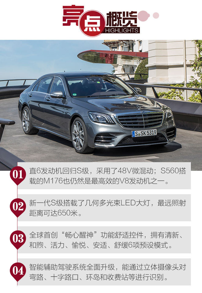 此次奔驰S级 (配置|询价)的中期改款显然是针对动力和配置方面进行了大量技术升级,尤其是重新引入的直列六缸发动机配合48V微混动系统,将极大提升车辆的动力效能;“畅心醒神”功能的加入则进一步强化了奔驰S级作为品牌旗舰的豪华感和人性化;辅助驾驶功能的升级在保证了车辆行驶安全性的同时也可大大减轻驾驶员的负担与疲劳。综合来看,新一代S级进行了非常全面的提升,综合竞争力显然更上了一个台阶。