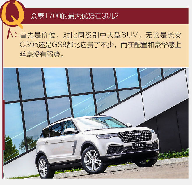 众泰T700在5月底正式上市,官方售价为10.68-15.58万,分布在10个车型上,其中售价13.98万元的1.8T自动尊贵型是1.8T车型中的次顶配,也是本次的试驾车型。可能你会说它怎么和GS8、CS95等车比,别忘了它们主要定位的消费群体不一样,更低廉的价格去买一个同样体型、差不多配置的中大型SUV,肯定是某些消费者的诉求,而T700也是为了应对这些人而来。