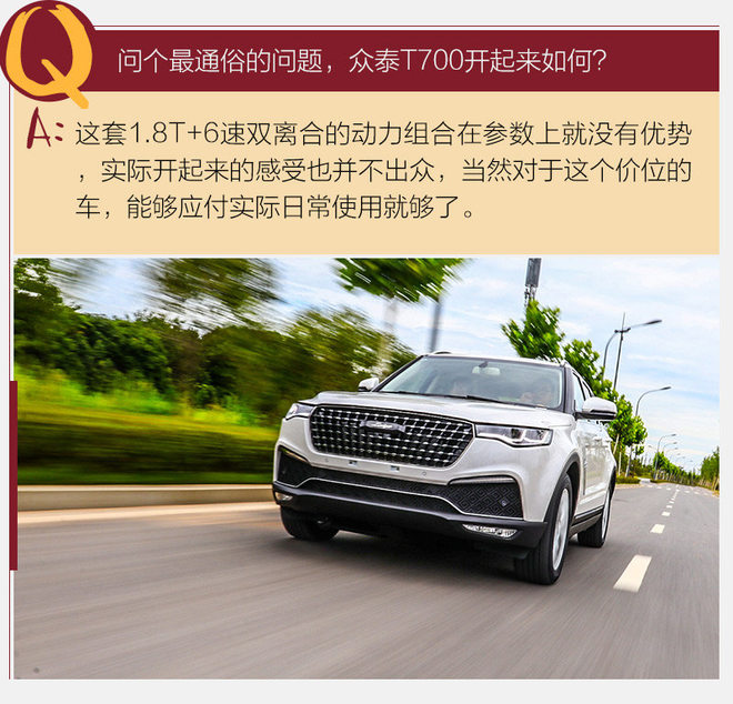 众泰T700确实不是那种看起来不错,一开起来马上就掉价的车,至少整体的驾驶品质还算不错,不能说有多优秀,起码在隔音、底盘和变速箱的水准上已经能和一些合资品牌相持平,这已经非常难得了,至于再有什么更高的要求,恐怕还需要时间。